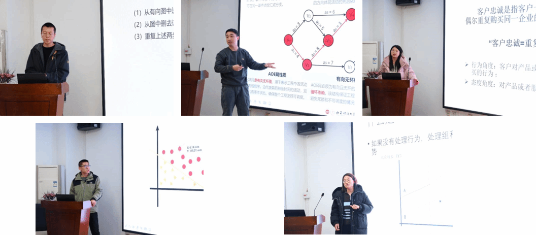 参赛教师聚焦学科前沿与智能技术,呈现了精彩纷呈的教学展示。郝剑龙老师逻辑严密地阐释了“拓扑排序与邻接表搜索”的算法核心;张鹏老师在讲解“AOE网”时,创新引入AI智能体,实现抽象拓扑关系的动态可视化;郭敏老师从生活案例出发,生动剖析“客户满意陷阱”背后的管理学原理;肖宁老师在阐述“支持向量机分类”时,由直观到抽象,并辅以数字人讲解,增强理解维度;张丽华老师系统解读“平行趋势假设”,融理论深度与教学艺术于一体。各位教师的展示,生动体现了“以学生为中心”的教学理念、融合创新的教学设计以及信息技术与教育深度融合的积极探索。
