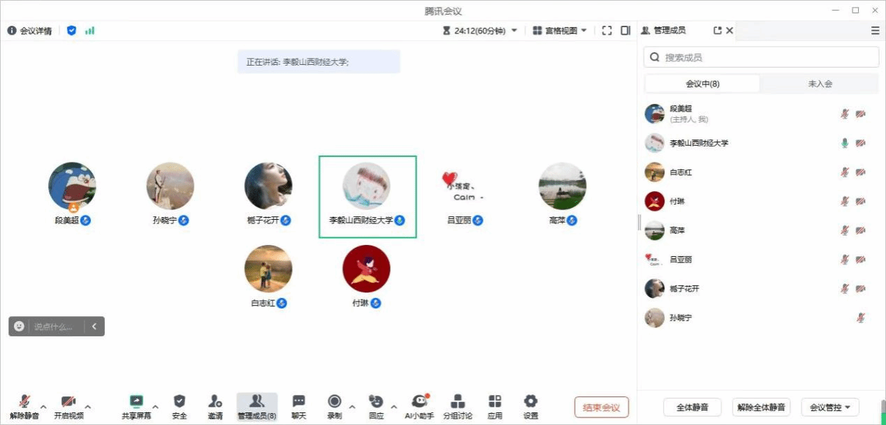 李毅指出,高校是教育、科技、人才的集中交汇点,要深入学习贯彻全会精神,深刻把握进一步全面深化改革的新思想、新观点、新论断,自觉把改革摆在更加突出位置。结合学院实际,就下一步如何通过深化改革提升学院的教学科研创新能力,提高人才自主培养质量,更加有效服务山西省的重大战略需求交流了三点工作思路。第一,扎实推进产教融合、科教融汇发展,着力强化高水平信息技术建设,发出信息声音;第二,持续开展教育教学提升年专项行动,坚持以习近平新时代中国特色社会主义思想为指导,以立德树人为根本任务,以学生全面发展为中心、以成果为导向、持续改进的教学理念;第三,着力夯实财经大学信息人才培养主阵地,切实履行一流学科、一流专业建设主体责任,创新人才培养模式,造就卓越创新信息人才。